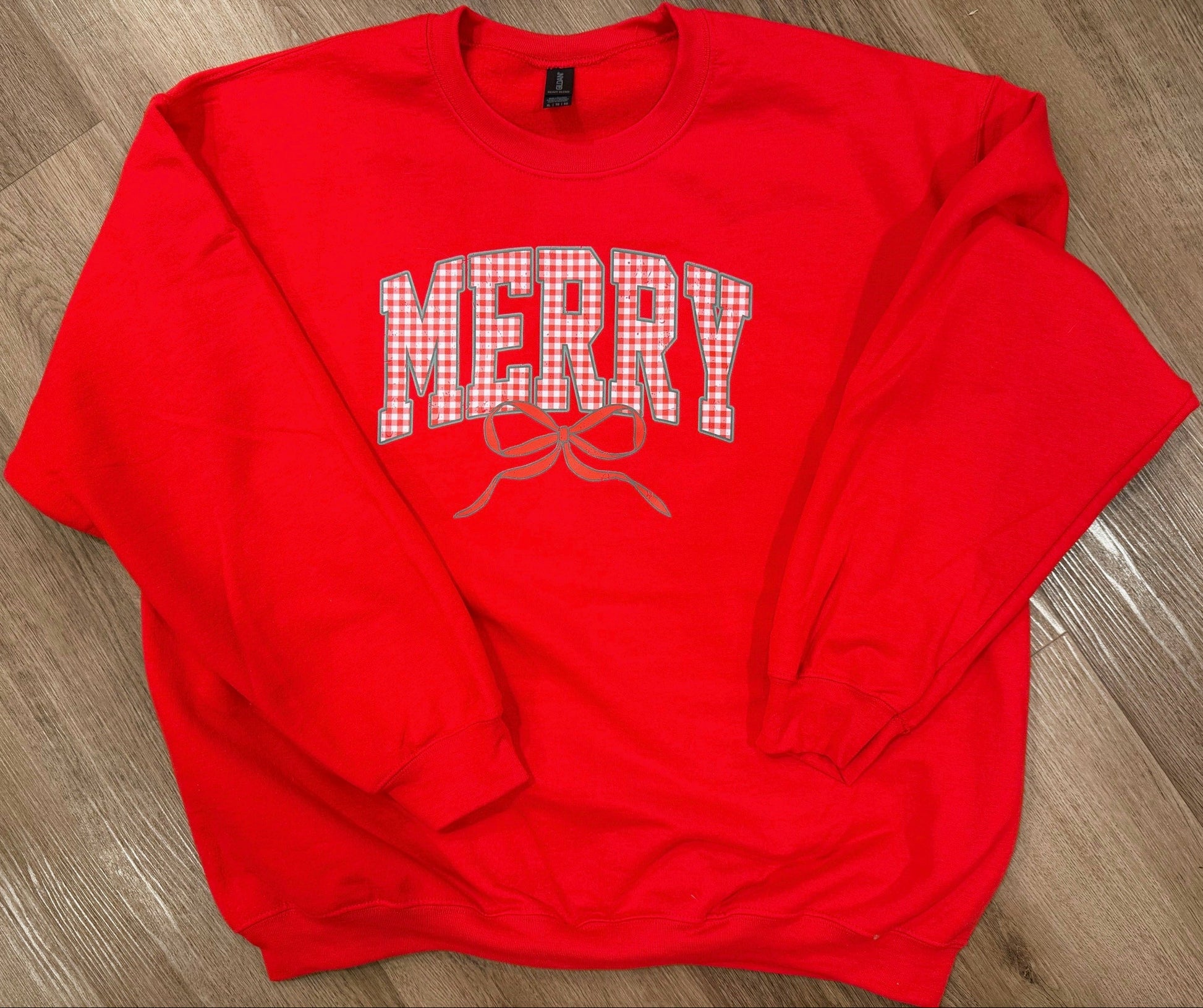 Get into the holiday spirit with our cheerful red “MERRY” sweatshirt — the perfect blend of cozy and festive. The bold gingham-patterned lettering adds a charming, classic Christmas touch, while the sweet bow illustration beneath completes the playful holiday vibe. Made in a soft, comfortable fabric with a relaxed fit, it’s ideal for holiday parties, family photos, or curling up with a cup of cocoa.